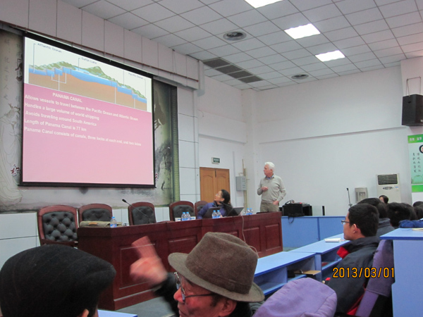 讲座中,爱德华教授介绍了他单人驾船横渡南太平区域时的所见所闻,包括巴拿马运河的介绍,南太平诸岛的地理、生物及风土人情。
